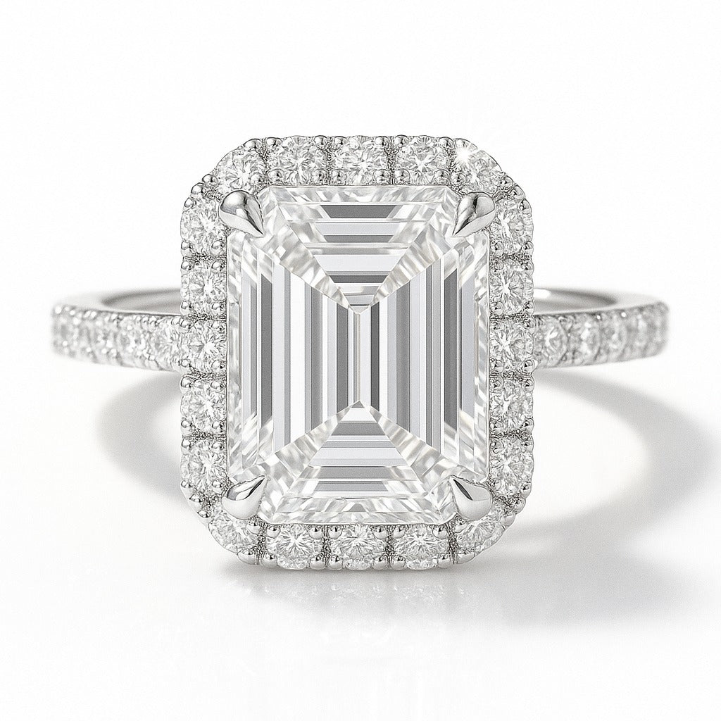 Celebrate timeless elegance with this stunning 2 carat lab-grown emerald-cut diamond halo engagement ring, certified by IGI for its exceptional quality. The center diamond features E/F colour and VS clarity, ensuring brilliance and sophistication. Surrounding the emerald diamond, a sparkling halo of accent stones enhances its fire and radiance, creating a luxurious and eye-catching design.