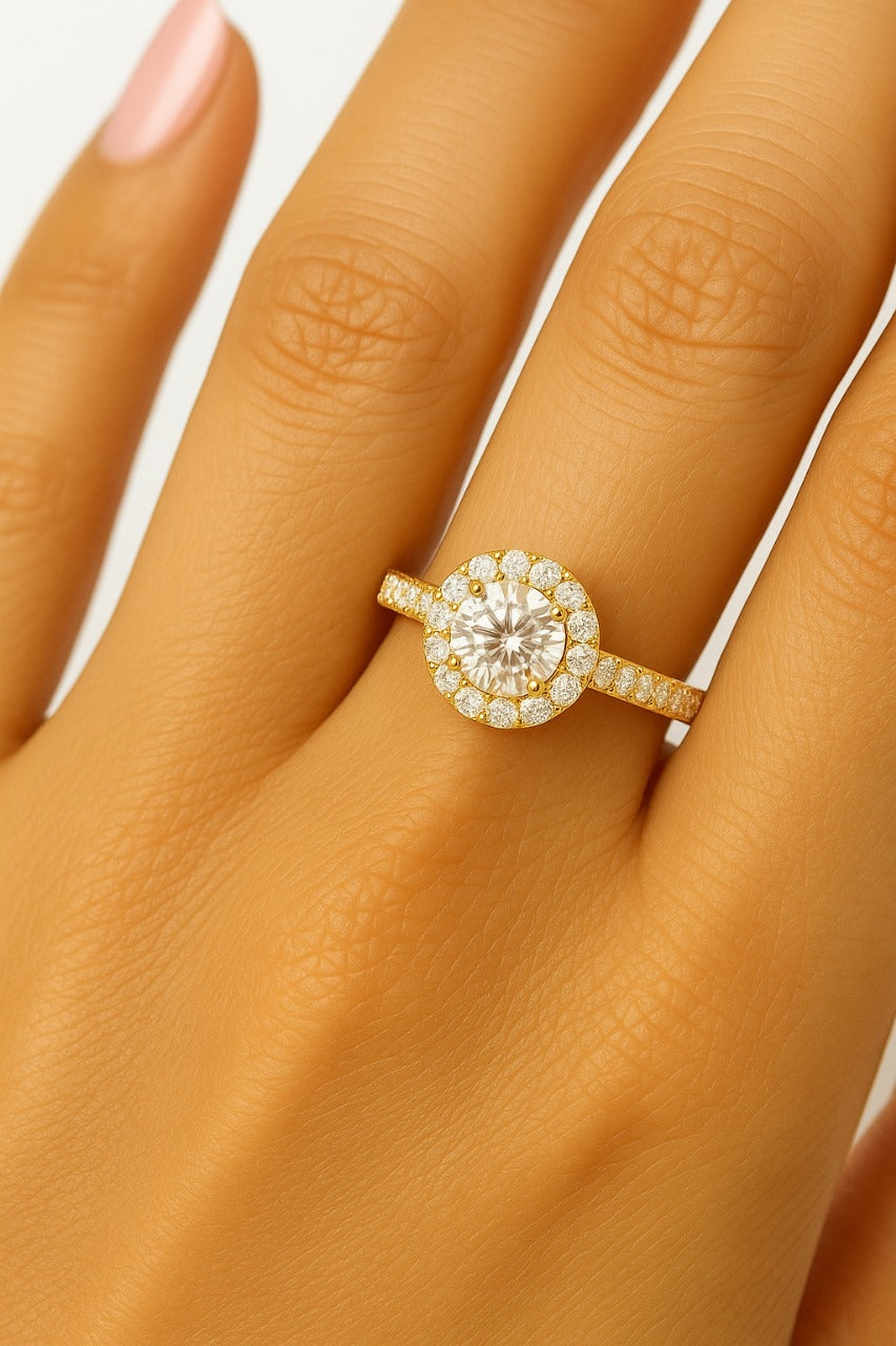 This elegant engagement ring features a 0.5-carat IGI-certified lab-grown round diamond, showcasing exceptional brilliance with E/F colour and VS clarity. The center stone is beautifully framed by a sparkling halo setting, enhancing its radiance and timeless appeal.