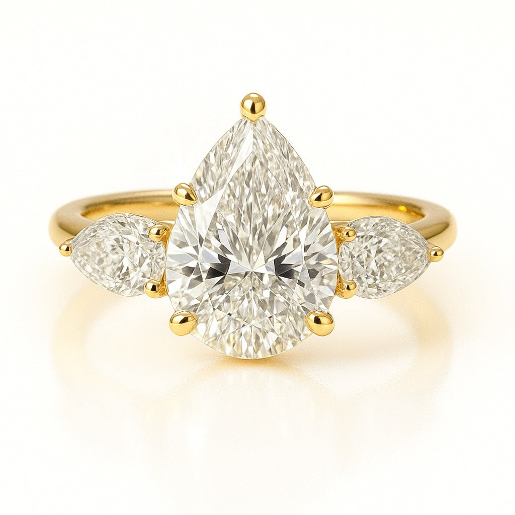 Celebrate timeless elegance with this 1.5 carat lab-grown pear diamond trilogy engagement ring, beautifully handcrafted in Dubai. The IGI-certified pear-shaped center diamond (1.5ct) shines in E/F colour and VS clarity, perfectly complemented by two matching side diamonds of 0.30ct each.