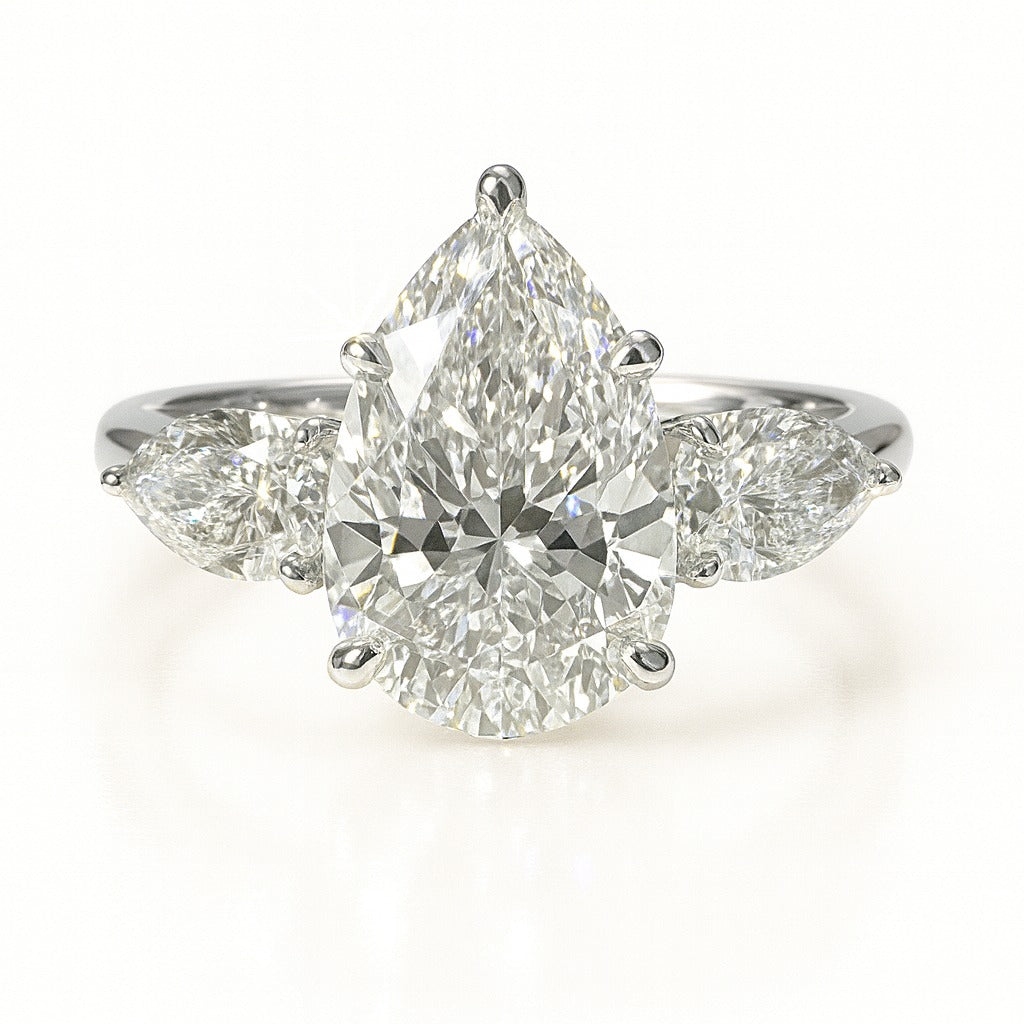 This exquisite trilogy engagement ring features a dazzling 2.5 carat IGI-certified lab-grown pear-shaped diamond as the centre stone, graded E/F colour and VS clarity for exceptional brilliance. Flanked by two 0.30 carat lab-grown side diamonds, carefully matched in colour and clarity, the design symbolises love, partnership, and a radiant future together.